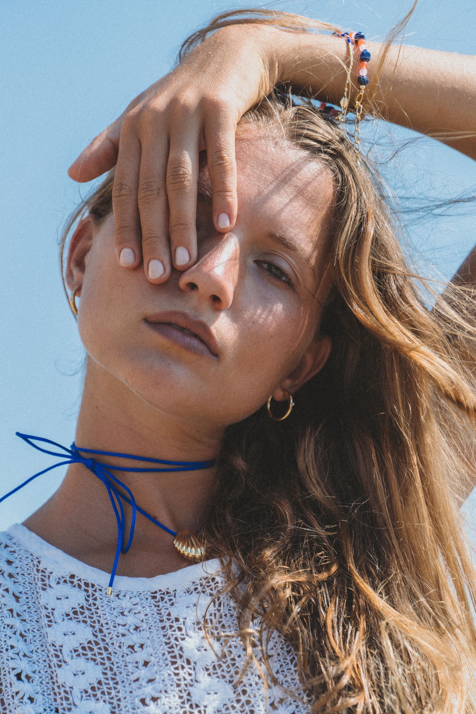An ocean-inspired treasure with subtle silver details, The Shell on a String features two strings, one in blue and one in green. Wear it as a wrapped choker or a long necklace for a versatile and playful look.