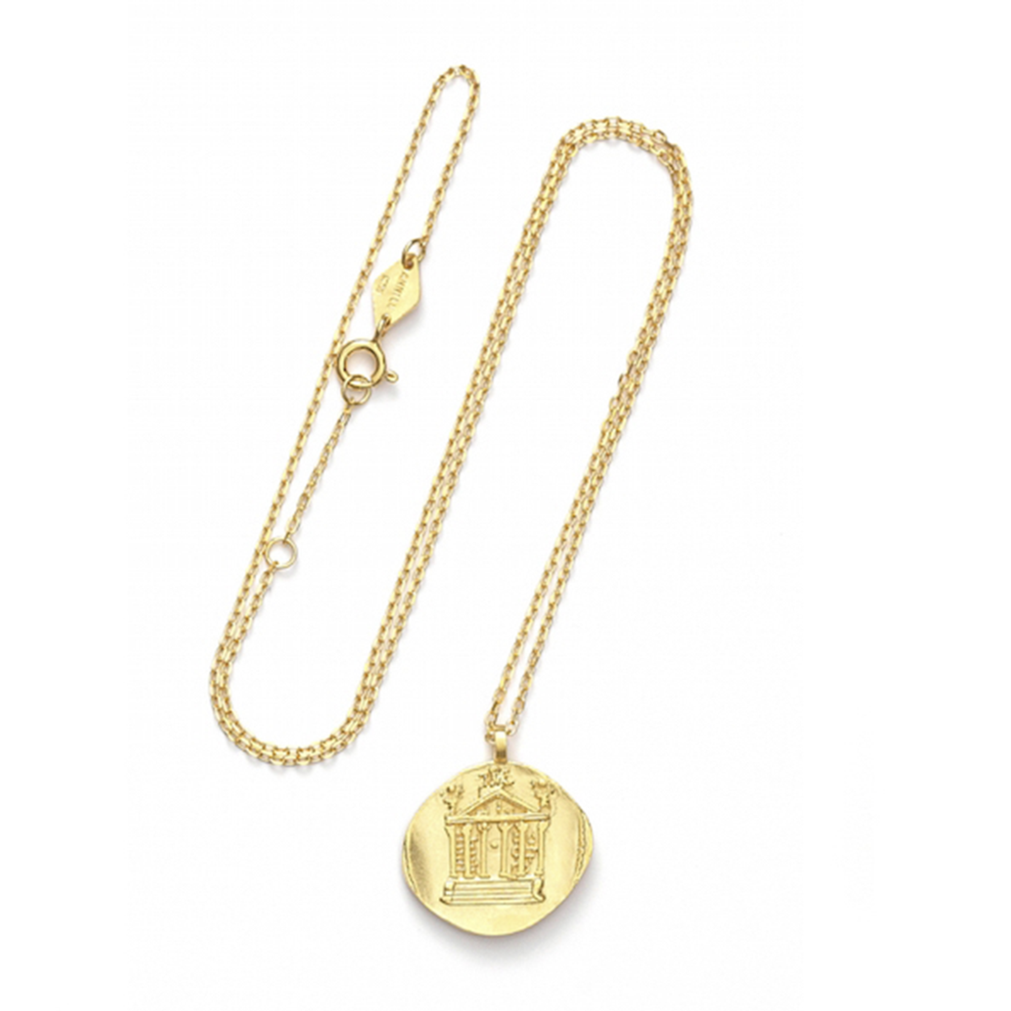 Faustina was also portrayed on the back side of the coin, that inspired the ‘Love’ necklace. On the front the ‘Love’ necklace features the Temple of Faustina, dedicated to Faustina after her death near Rome in 140 by a devastated Antoninus.