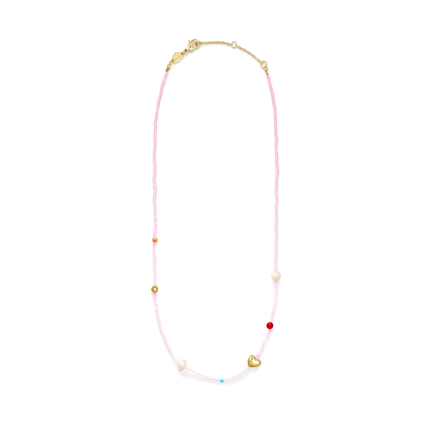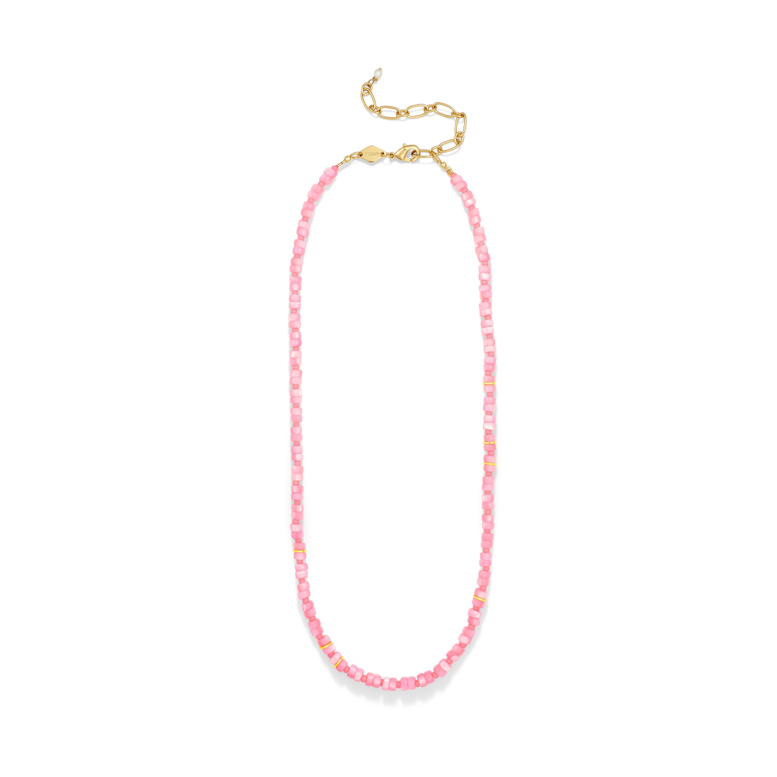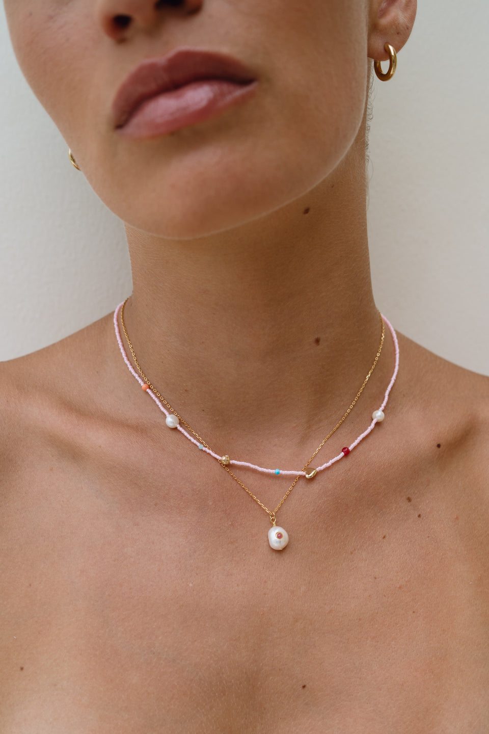 Dazzling mother-of-pearl beads and shimmering gold details bring this necklace to life. Girly yet sophisticated, it’s an enchanting piece that dances on the skin with every movement.
